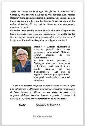 Ma fenêtre à Bonheur, Prix Corneille, Prix des Arts et Lettres et Prix Bouilhet 2016, Michel Delaunay signe ce nouveau roman à suspense. Une intrigue dont la trame trépidante oscille entre les feux de la cité balnéaire et les ombres d’Andaines-Écouves où des forces occultes complotent, menacent et tuent...